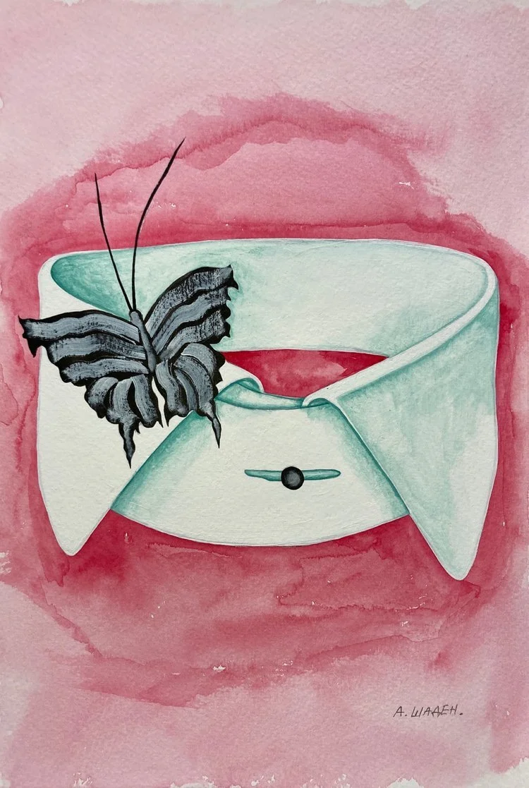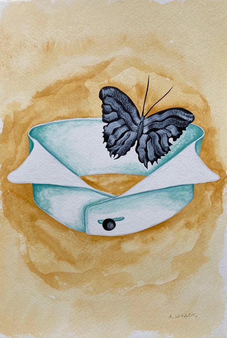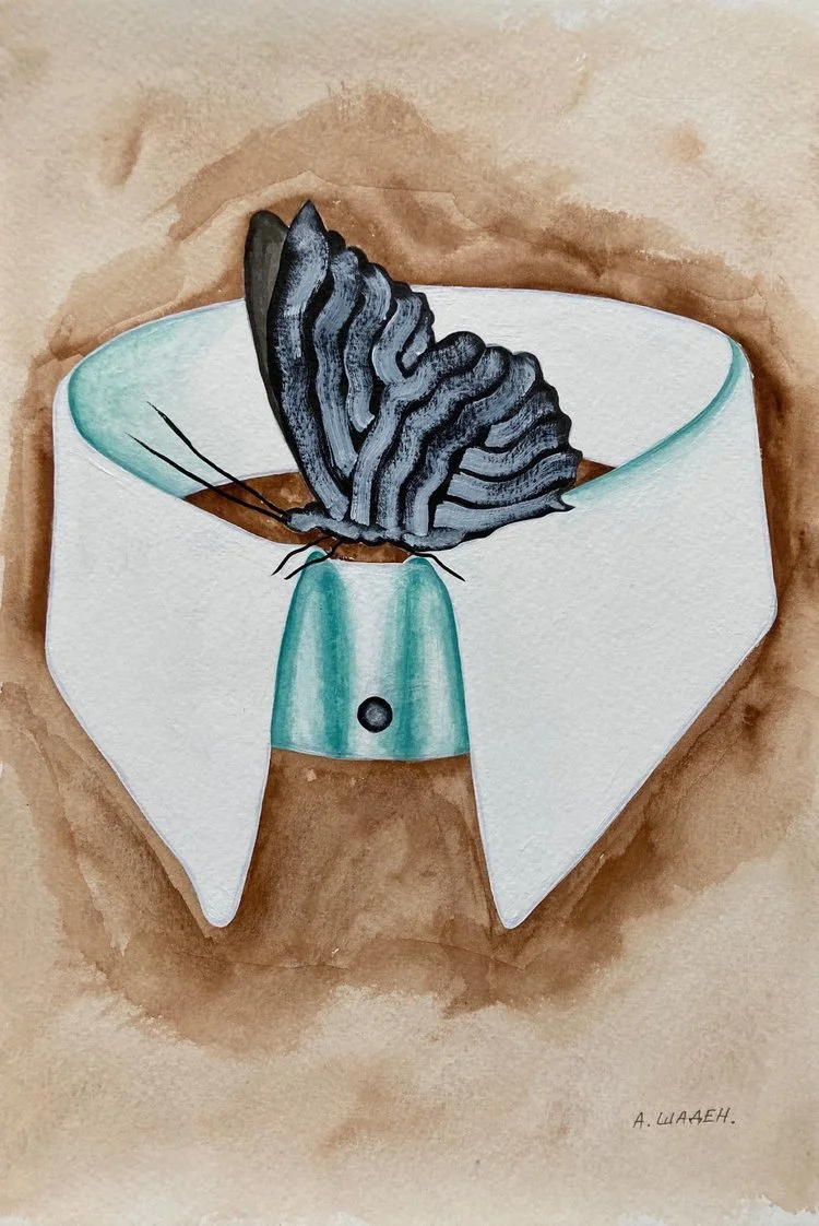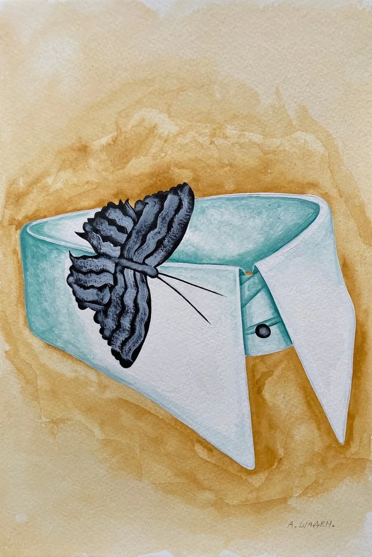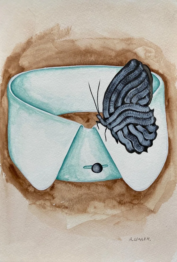 Made exclusively for Ainalaiyn Space, these paintings emerged from an enhanced understanding of the collars’ material qualities. Shadenova uses the delicacies of the watercolours and the image of the butterfly in contrast to the collars’ own rigidity; something that could have only been discovered through thoughtful and conscious play with these historical garments.