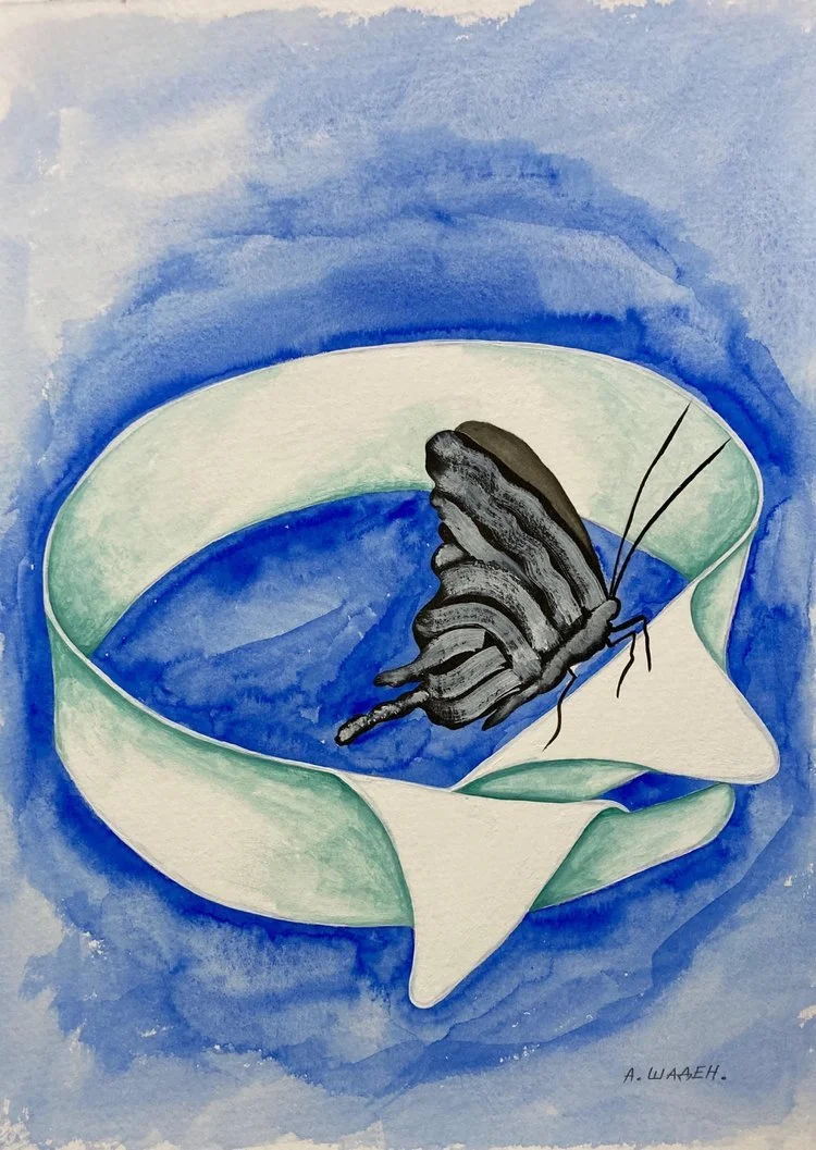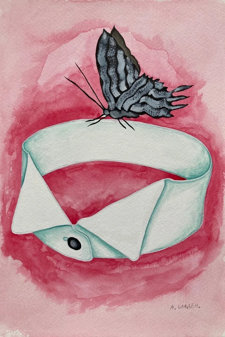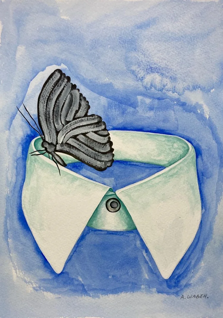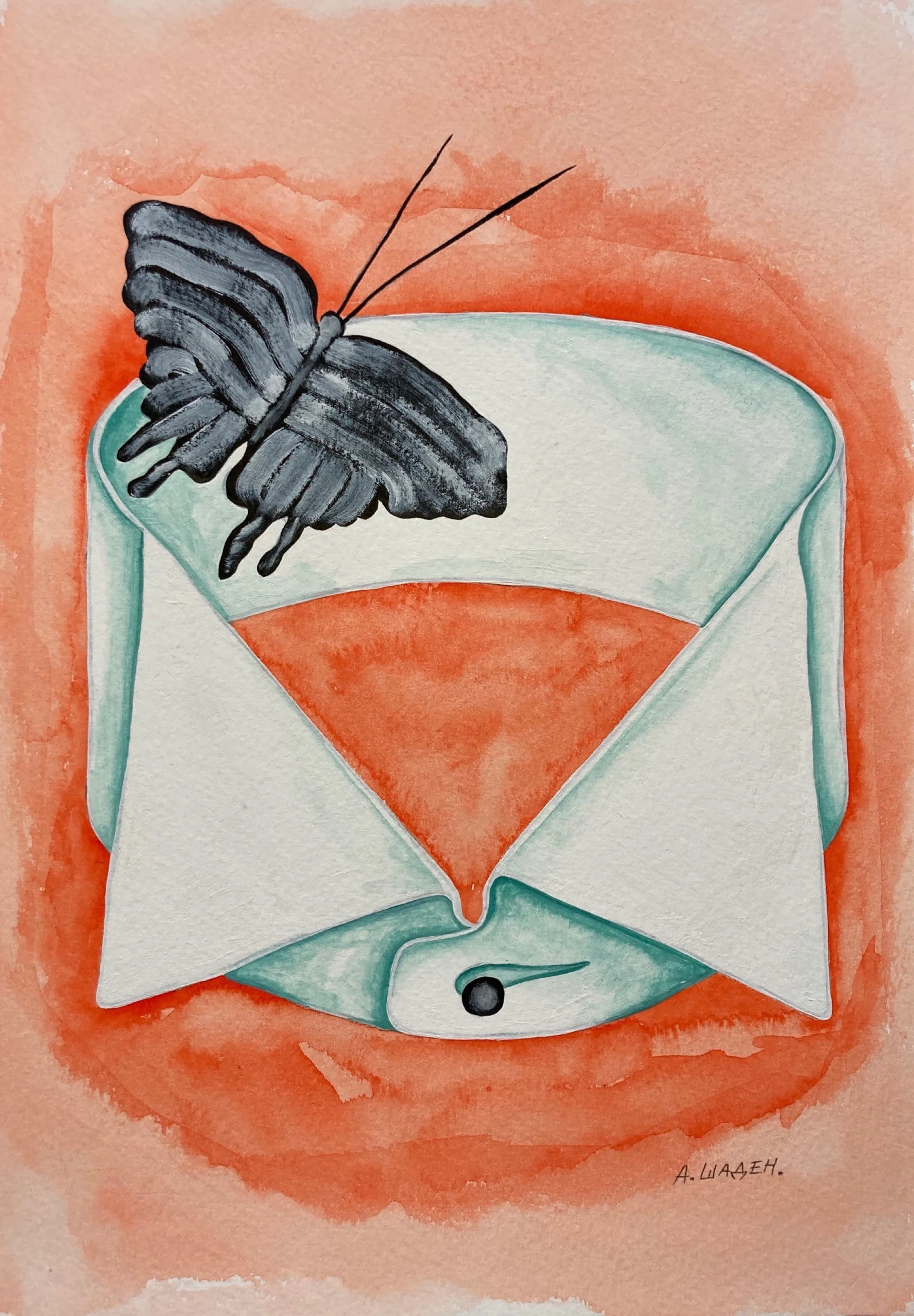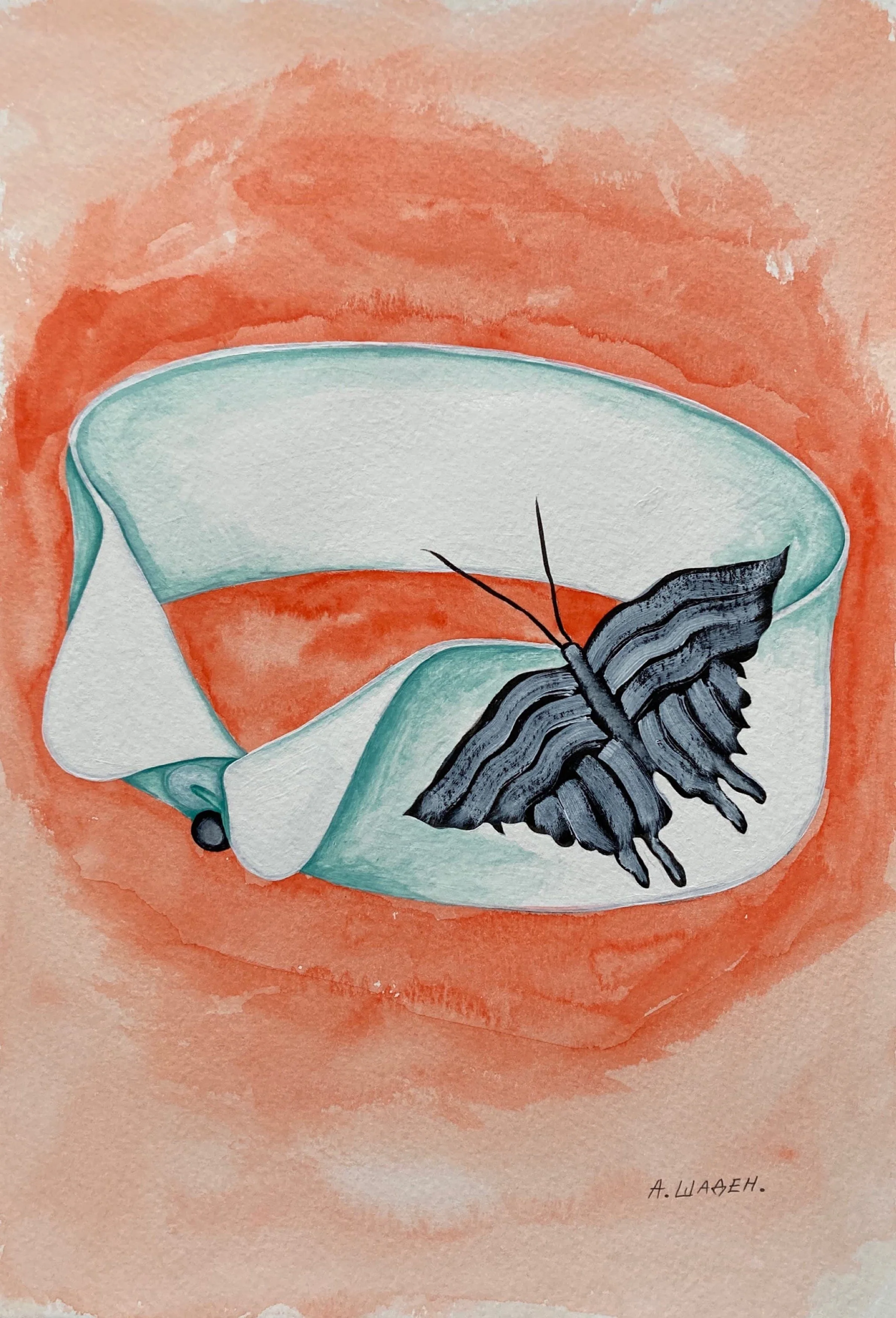 Made exclusively for Ainalaiyn Space, these paintings emerged from an enhanced understanding of the collars’ material qualities. Shadenova uses the delicacies of the watercolours and the image of the butterfly in contrast to the collars’ own rigidity; something that could have only been discovered through thoughtful and conscious play with these historical garments.