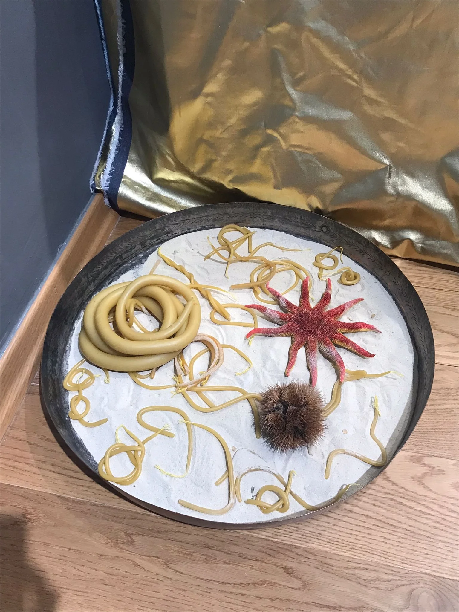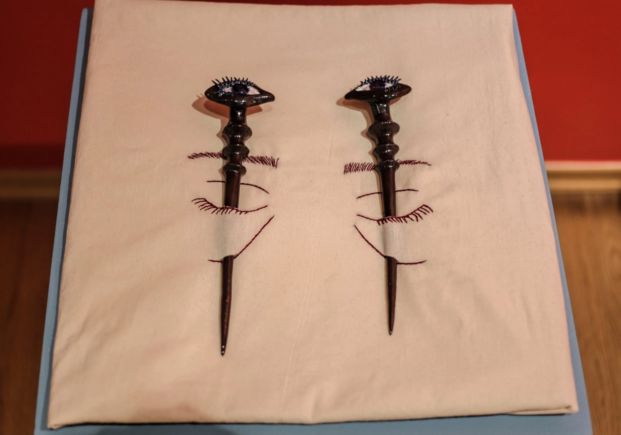 2022, glazed ceramic and embroidered fabric, dimensions variable