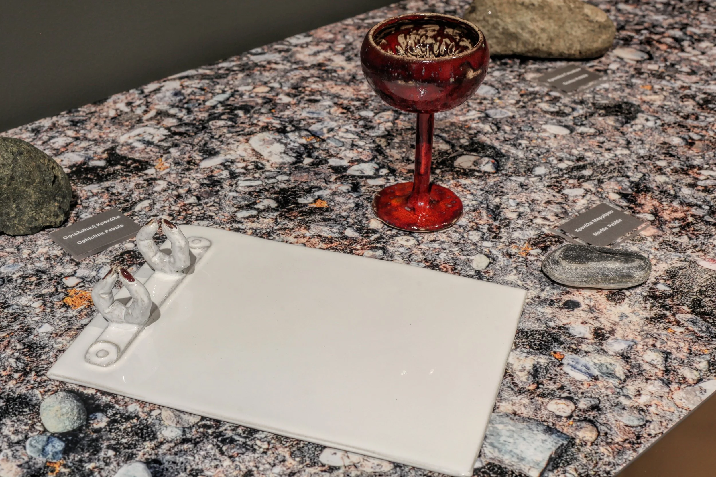 Stone and ceramics share an enduring and entangled history with death and funerary practices. Stones have been used to mark burial sites across many geographies and contexts. As explored in Cultures of Stone, “[stone’s] enduring character [creates] a link through generations to both people and place”.[2] The endurance of stone allows it to surpass human life, endowing it with a monumentality and the responsibility to archive our past. Pottery, in particular, the urn, also commemorates the dead and stores their remains. Yet, its very materiality and terminology recalls the transformed body it is tasked to hold. The language of pottery endows it with corporality. The urn is held upright by its feet and its lid will be secured by its neck and possibly its lip. Moreover, ceramic forms are composed of pulversied stone and earth which echoes the composition of the body after death, either cremated or buried. Therefore stone, pottery, the body and death are entangled which the works in In Flux evidence and celebrate.